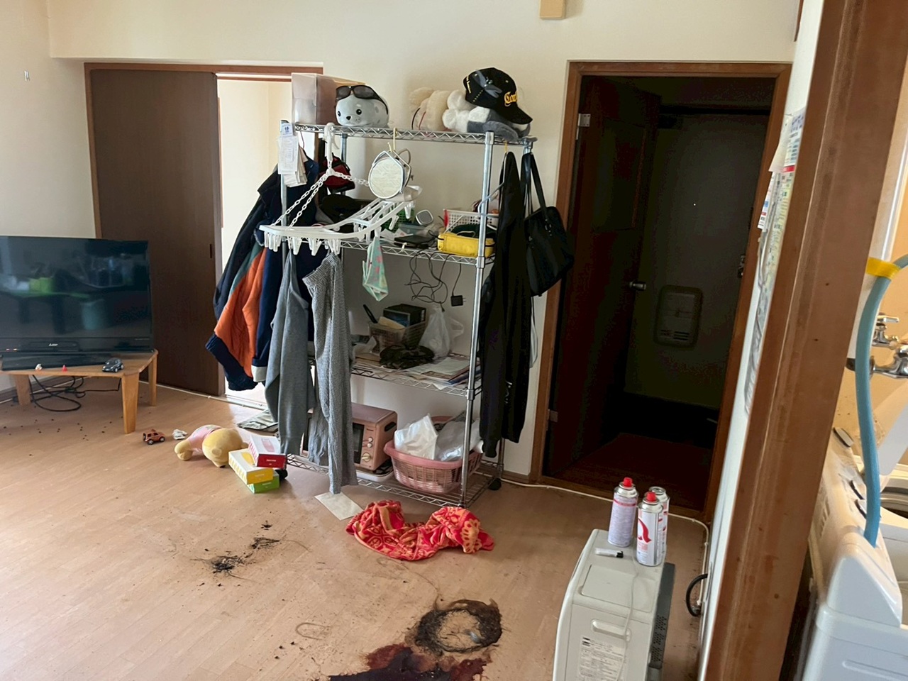 現場に入りますとご遺体こそありませんが、独特な腐敗臭が鼻を突き、マスクをしていてもはっきりわかる状態でした。